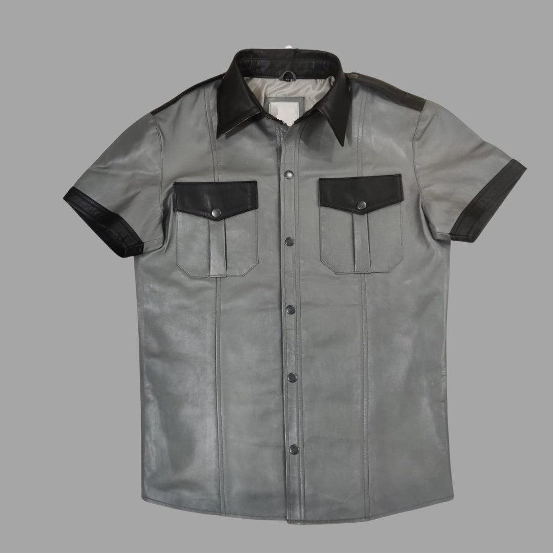 Dark Grey Leather Shirt For Men With Black Collar - 2X-Small